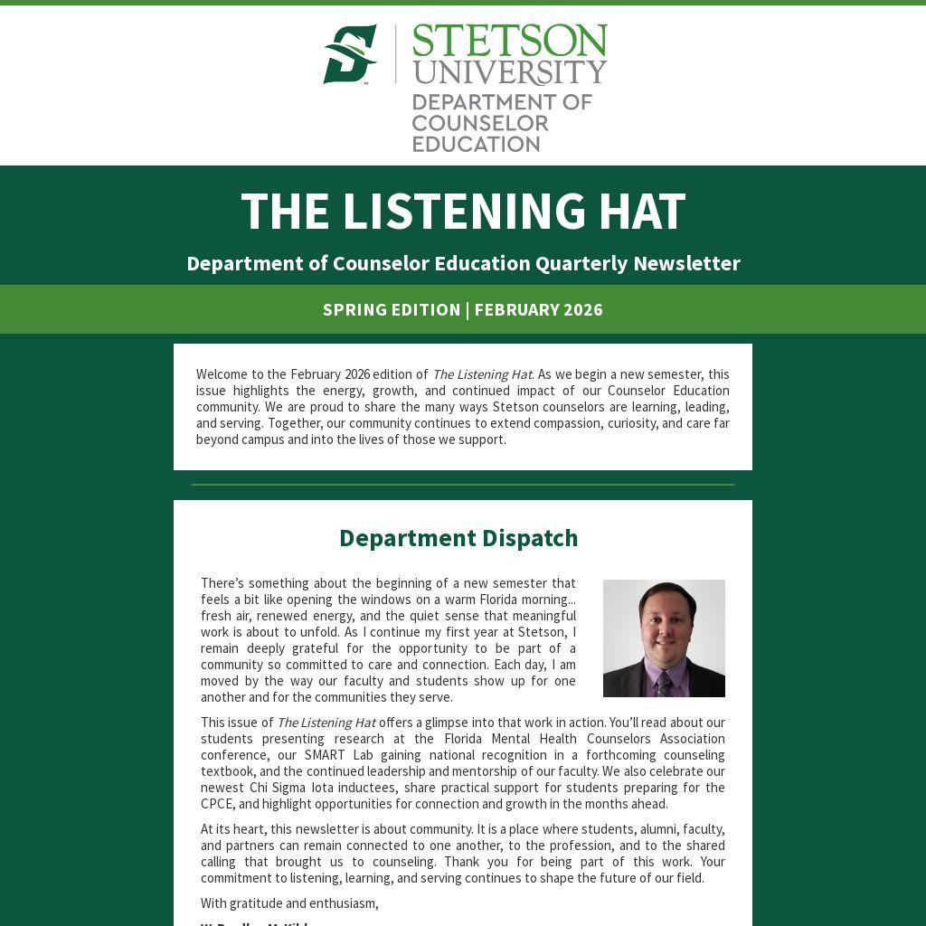 Welcome to the February 2026 edition of The Listening Hat. As we begin a new semester, this issue highlights the energy, growth, and continued impact of our Counselor Education community. We are proud to share the many ways Stetson counselors are learning, leading, and serving. Together, our community continues to extend compassion, curiosity, and care far beyond campus and into the lives of those we support.