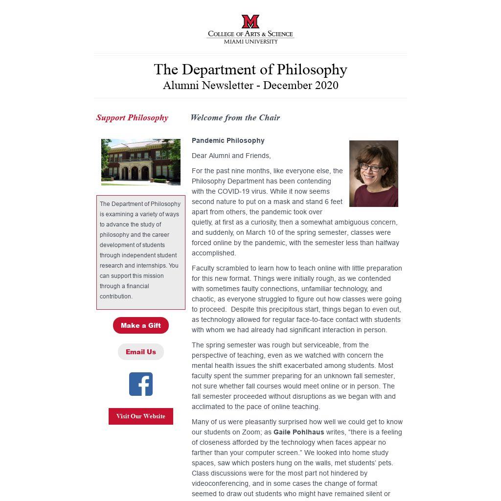 For the past nine months, like everyone else, the Philosophy Department has been contending with the COVID-19 virus. While it now seems second nature to put on a mask and stand 6 feet apart from others, the pandemic took over quietly, at first as a curiosity, then a somewhat ambiguous concern, and suddenly, on March 10 of the spring semester, classes were forced online by the pandemic, with the semester less than halfway accomplished.