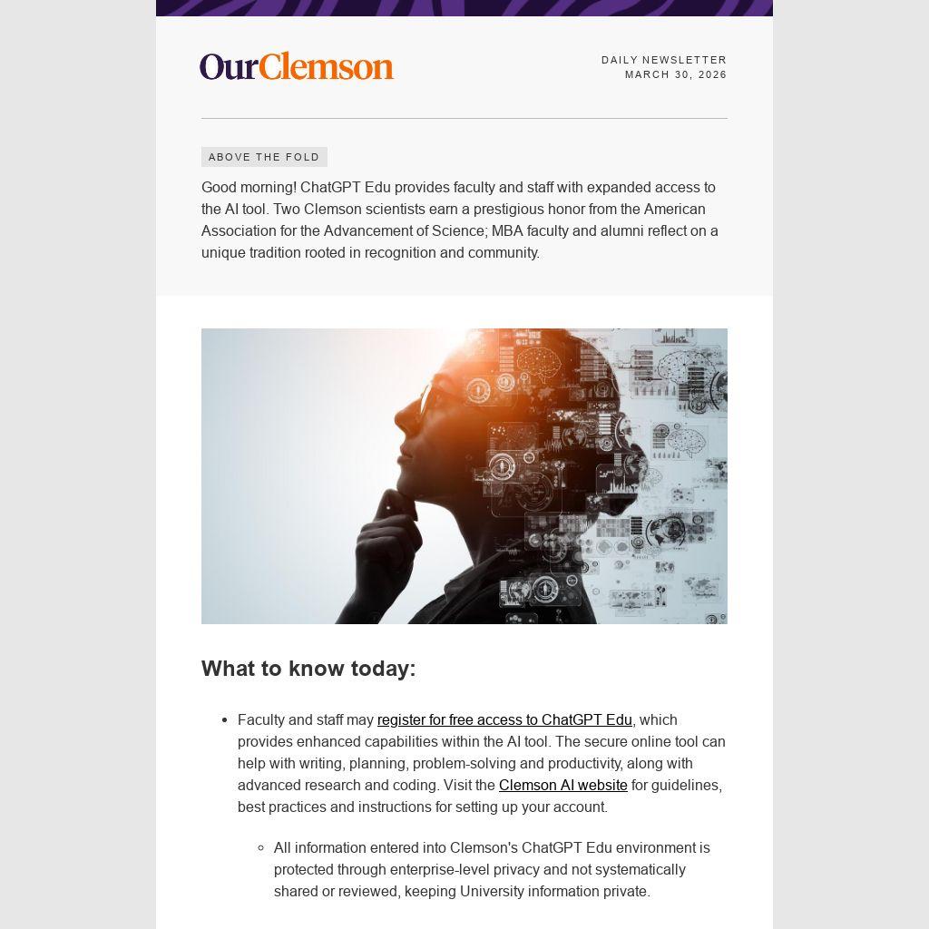 Good morning! ChatGPT Edu provides faculty and staff with expanded access to the AI tool. Two Clemson scientists earn a prestigious honor from the American Association for the Advancement of Science; MBA faculty and alumni reflect on a unique tradition rooted in recognition and community.