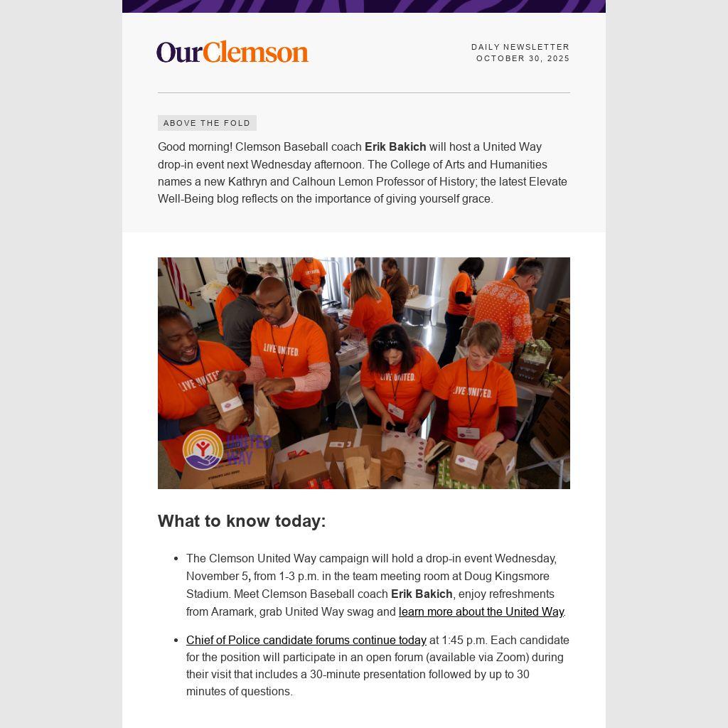 Good morning! Clemson Baseball coach Erik Bakich will host a United Way drop-in event next Wednesday afternoon. The College of Arts and Humanities names a new Kathryn and Calhoun Lemon Professor of History; the latest Elevate Well-Being blog reflects on the importance of giving yourself grace.
