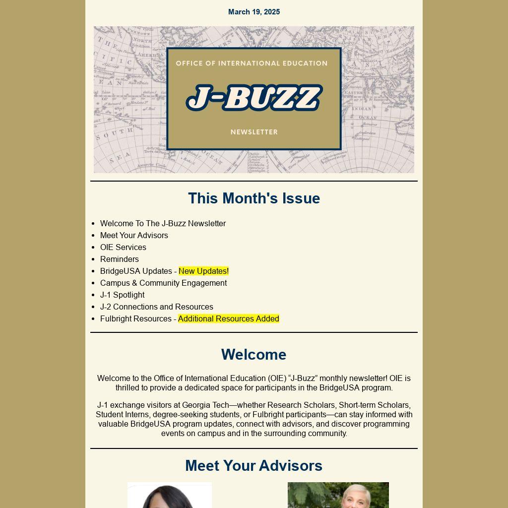 Welcome to the Office of International Education (OIE) “J-Buzz” monthly newsletter! OIE is thrilled to provide a dedicated space for participants in the BridgeUSA program.