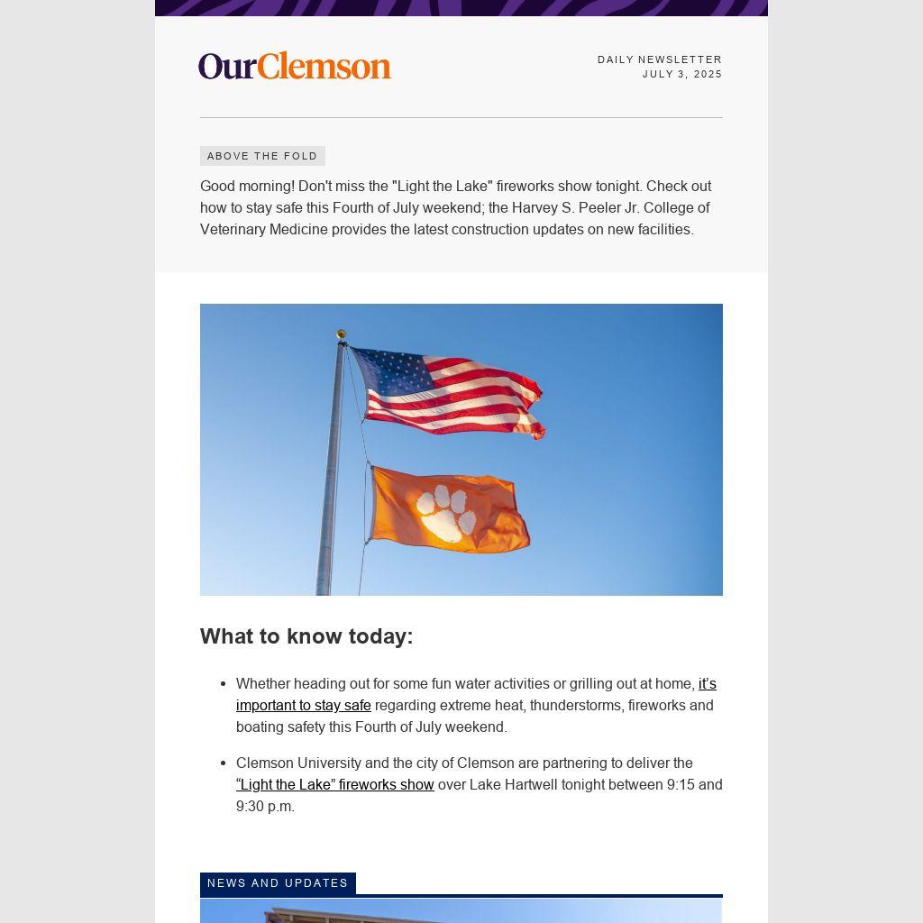 Good morning! Don't miss the "Light the Lake" fireworks show tonight. Check out how to stay safe this Fourth of July weekend; the Harvey S. Peeler Jr. College of Veterinary Medicine provides the latest construction updates on new facilities.
