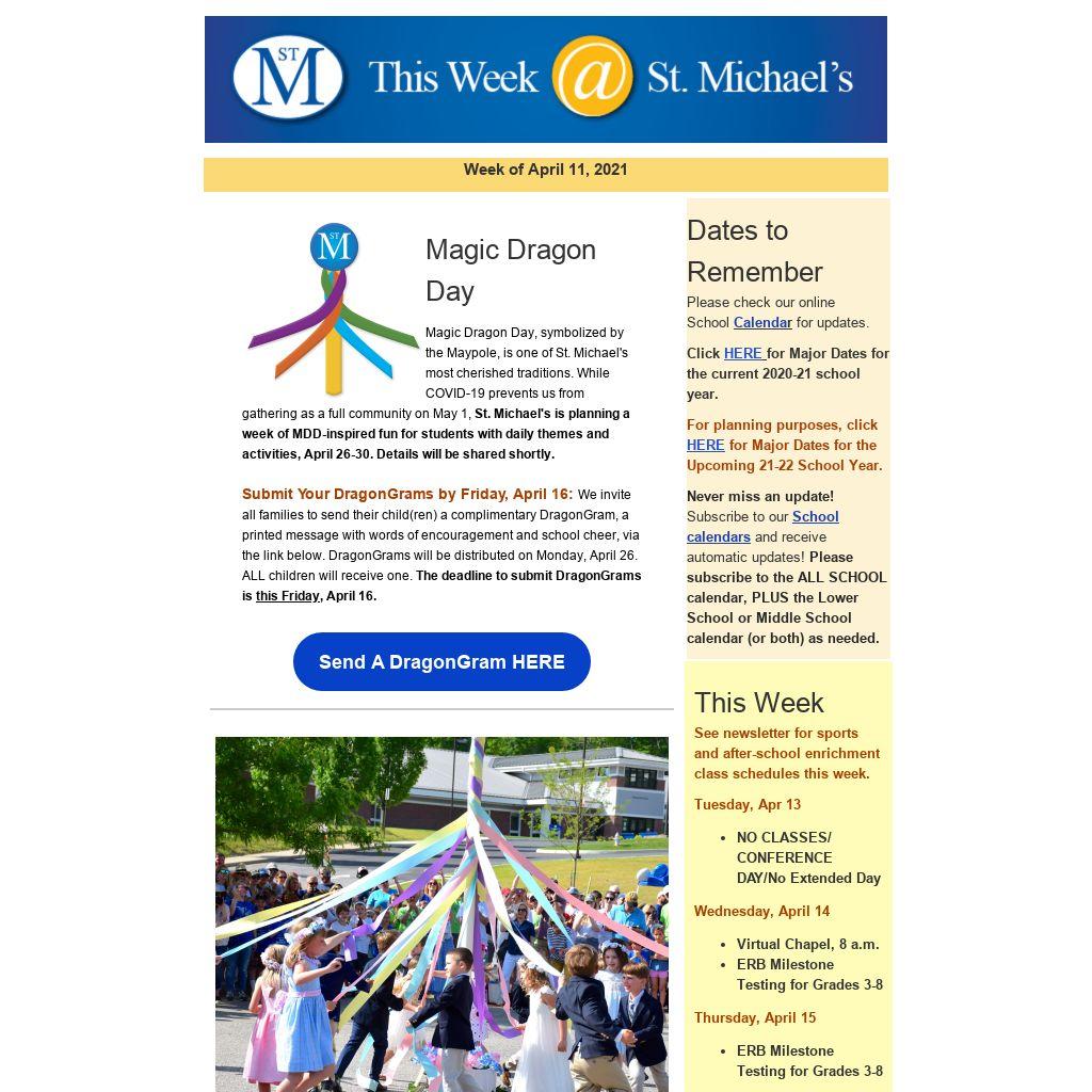 Magic Dragon Day, symbolized by the Maypole, is one of St. Michael's most cherished traditions. While COVID-19 prevents us from gathering as a full community on May 1, St. Michael's is planning a week of MDD-inspired fun for students with daily themes and activities, April 26-30. Details will be shared shortly.