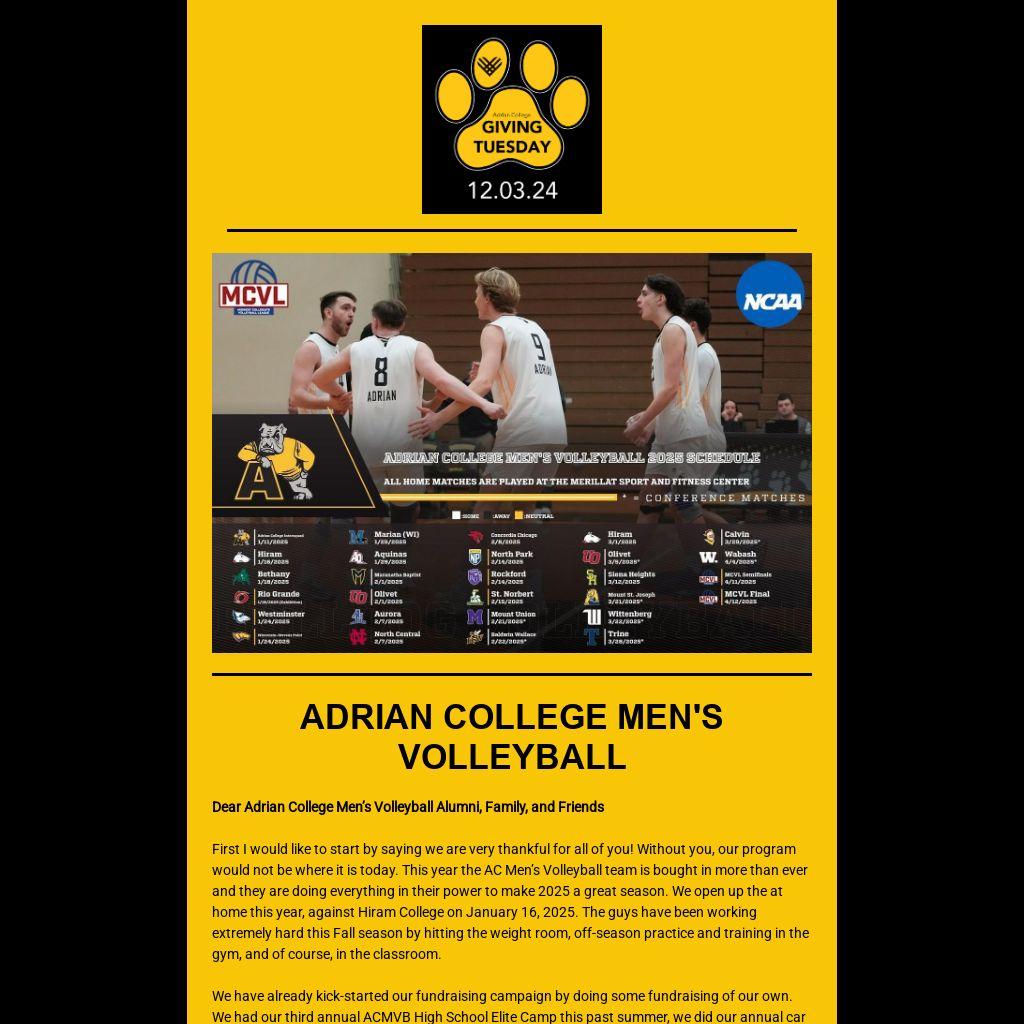 Dear Adrian College Men’s Volleyball Alumni, Family, and Friends