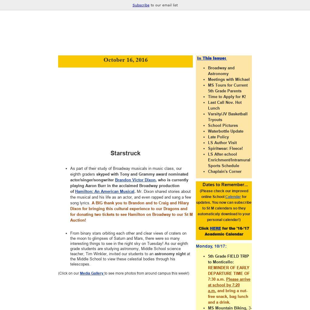 | Dates to Remember...(Please check our improved online School Calendar for updates. You now can subscribe to St M calendars so they automaticaly download to your personal calendar!) Click HERE for the '16-'17 Academic Calendar
