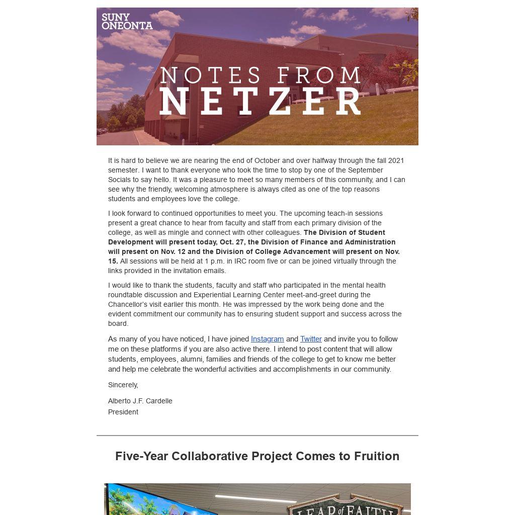 | It is hard to believe we are nearing the end of October and over halfway through the fall 2021 semester. I want to thank everyone who took the time to stop by one of the September Socials to say hello. It was a pleasure to meet so many members of this community, and I can see why the friendly, welcoming atmosphere is always cited as one of the top reasons students and employees love the college.