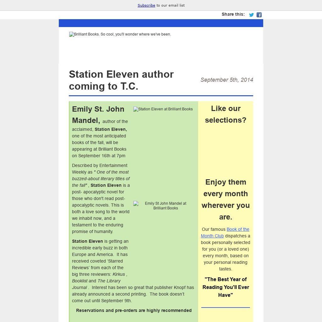 Emily St. John Mandel, author of the acclaimed, Station Eleven, one of the most anticipated books of the fall, will be appearing at Brilliant Books on September 16th at 7pm