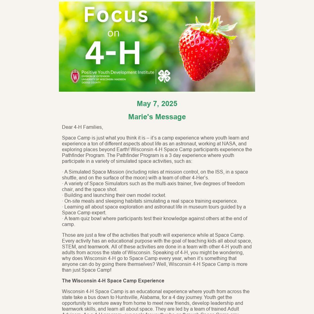 If you have Secretary's Minutes to share, please send them to the 4-H / Youth Program Assistant, Terra at: treider@wisc.edu by noon on Monday to be included in that week's issue. You can also contact the office with any questions. Thanks!