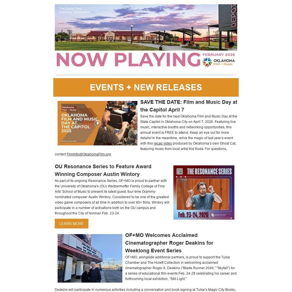 SAVE THE DATE: Film and Music Day at the Capitol April 7 Save the date for the next Oklahoma Film and Music Day at the State Capitol in Oklahoma City on April 7, 2026. Featuring live music, interactive booths and networking opportunities, this annual event is FREE to attend. Keep an eye out for more details! In the meantime, relive the magic of last year’s event with this recap video produced by Oklahoma’s own Ghost Cat, featuring music from local artist Kid Koda. For questions, contact FilmInfo@OklahomaFilm.org.