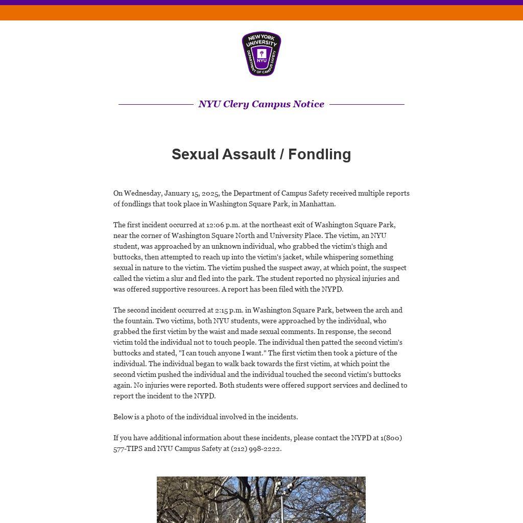 On Wednesday, January 15, 2025, the Department of Campus Safety received multiple reports of fondlings that took place in Washington Square Park, in Manhattan.