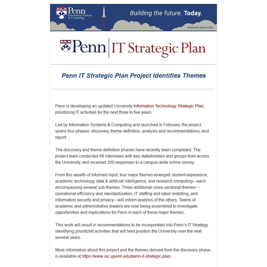 More information about this project and the themes derived from the discovery phase is available at https://www.isc.upenn.edu/penn-it-strategic-plan.