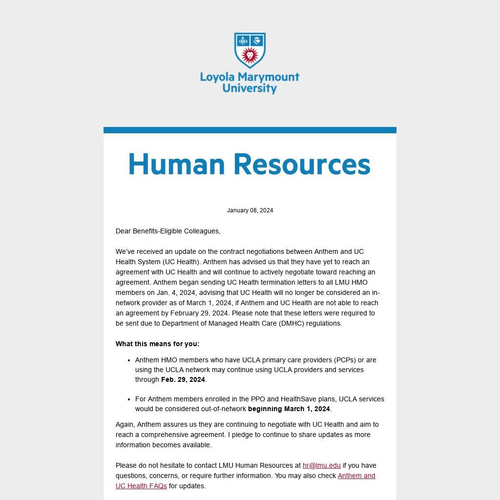 Recibimos una actualización sobre las negociaciones contractuales entre Anthem y UC Health System (UC Health). Anthem nos informó que aún no han llegado a un acuerdo con UC Health y continúuan rán negociando activamente para llegar a un acuerdo. Anthem comenzóó a enviar cartas de despido terminación de UC Health a todos los miembros de LMU HMO el 4 de enero de 2024, notificando informando que UC Health ya no será considerado un proveedor dentro de la red a partir del 1 de marzo de 2024, si en caso que Anthem y UC Health no son no pudimos lleguenar a un acuerdo antes del 29 de febrero de 2024. Tengan en cuenta que estas cartas debían enviarsefueron enviadas debido a las regulaciones del Departamento de Atención Médica Administrada (DMHC).