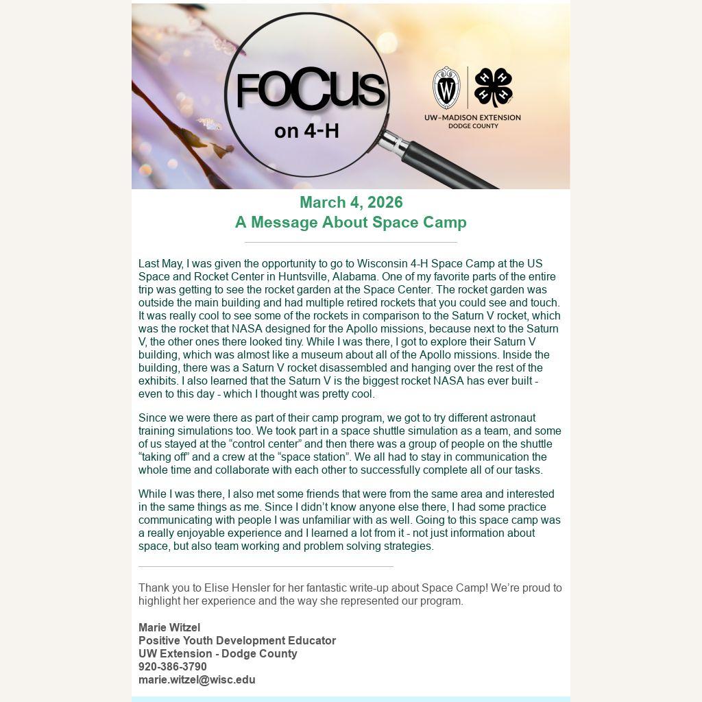 Last May, I was given the opportunity to go to Wisconsin 4-H Space Camp at the US Space and Rocket Center in Huntsville, Alabama. One of my favorite parts of the entire trip was getting to see the rocket garden at the Space Center. The rocket garden was outside the main building and had multiple retired rockets that you could see and touch. It was really cool to see some of the rockets in comparison to the Saturn V rocket, which was the rocket that NASA designed for the Apollo missions, because next to the Saturn V, the other ones there looked tiny. While I was there, I got to explore their Saturn V building, which was almost like a museum about all of the Apollo missions. Inside the building, there was a Saturn V rocket disassembled and hanging over the rest of the exhibits. I also learned that the Saturn V is the biggest rocket NASA has ever built - even to this day - which I thought was pretty cool.