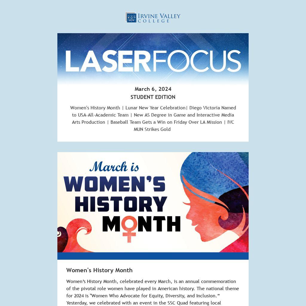 Women's History Month | Lunar New Year Celebration| Diego Victoria Named to USA-All-Academic Team | New AS Degree in Game and Interactive Media Arts Production | Baseball Team Gets a Win on Friday Over LA Mission | IVC MUN Strikes Gold