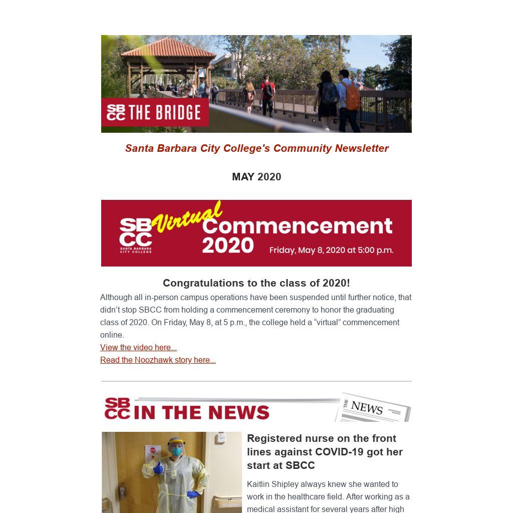 Congratulations to the class of 2020!Although all in-person campus operations have been suspended until further notice, that didn’t stop SBCC from holding a commencement ceremony to honor the graduating class of 2020. On Friday, May 8, at 5 p.m., the college held a “virtual” commencement online. View the video here... Read the Noozhawk story here...