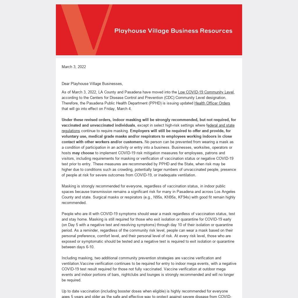 As of March 3, 2022, LA County and Pasadena have moved into the Low COVID-19 Community Level, according to the Centers for Disease Control and Prevention (CDC) Community Level designation. Therefore, the Pasadena Public Health Department (PPHD) is issuing updated Health Officer Orders that will go into effect on Friday, March 4.