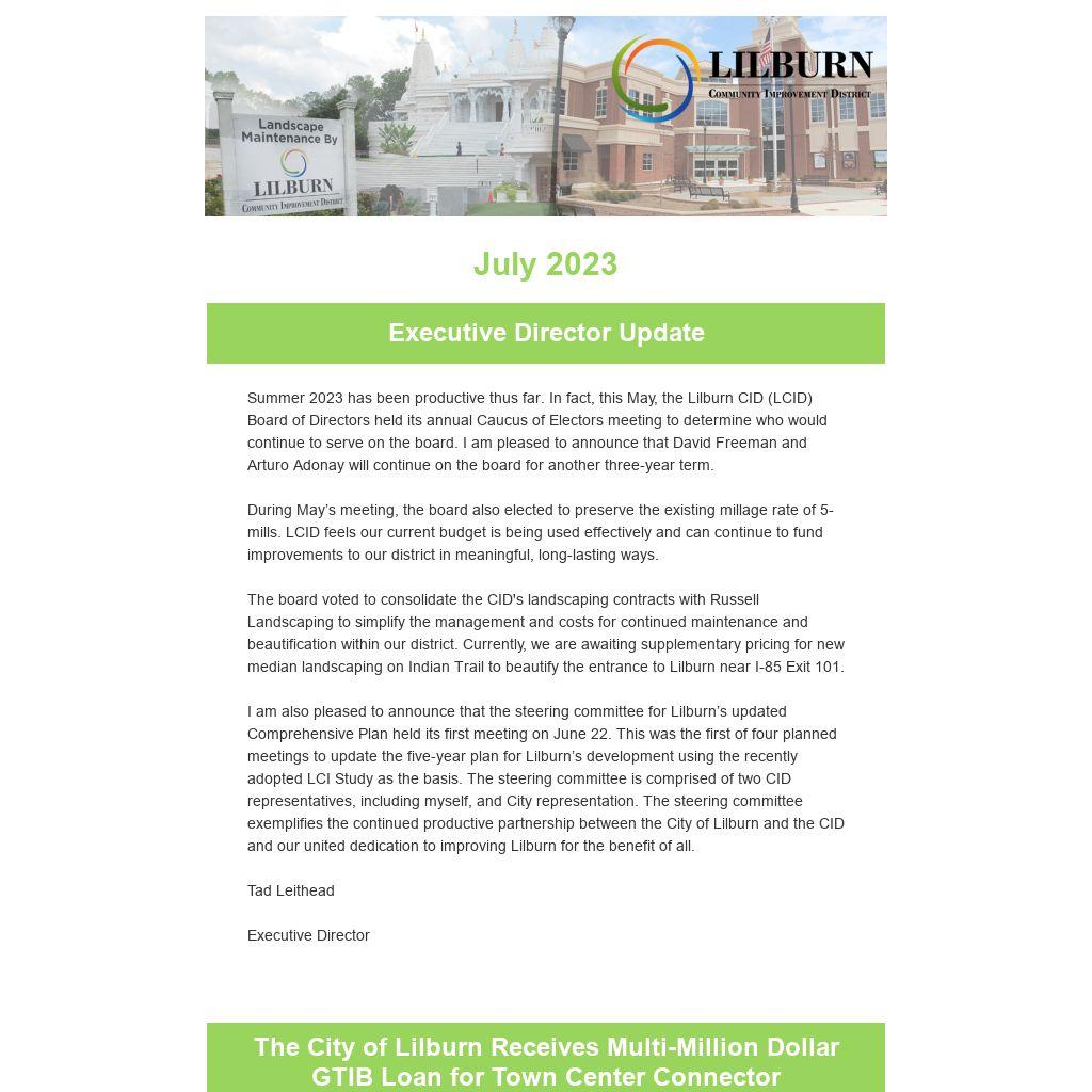 Summer 2023 has been productive thus far. In fact, this May, the Lilburn CID (LCID) Board of Directors held its annual Caucus of Electors meeting to determine who would continue to serve on the board. I am pleased to announce that David Freeman and Arturo Adonay will continue on the board for another three-year term.
