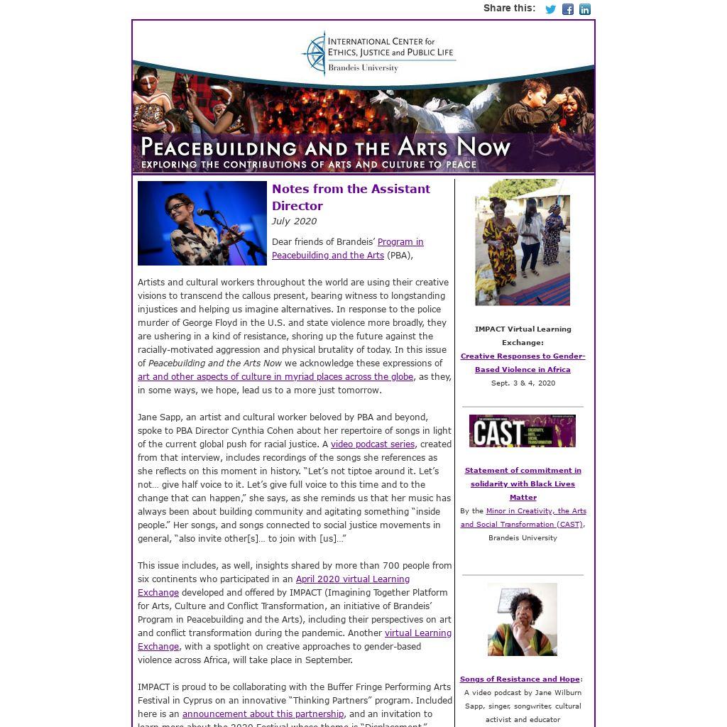 Artists and cultural workers throughout the world are using their creative visions to transcend the callous present, bearing witness to longstanding injustices and helping us imagine alternatives. In response to the police murder of George Floyd in the U.S. and state violence more broadly, they are ushering in a kind of resistance, shoring up the future against the racially-motivated aggression and physical brutality of today. In this issue of Peacebuilding and the Arts Now we acknowledge these expressions of art and other aspects of culture in myriad places across the globe, as they, in some ways, we hope, lead us to a more just tomorrow. Jane Sapp, an artist and cultural worker beloved by PBA and beyond, spoke to PBA Director Cynthia Cohen about her repertoire of songs in light of the current global push for racial justice. A video podcast series, created from that interview, includes recordings of the songs she references as she reflects on this moment in history. “Let’s not tiptoe around it. Let’s not… give half voice to it. Let’s give full voice to this time and to the change that can happen,” she says, as she reminds us that her music has always been about building community and agitating something “inside people.” Her songs, and songs connected to social justice movements in general, “also invite other[s]… to join with [us]…” This issue includes, as well, insights shared by more than 700 people from six continents who participated in an April 2020 virtual Learning Exchange developed and offered by IMPACT (Imagining Together Platform for Arts, Culture and Conflict Transformation, an initiative of Brandeis’ Program in Peacebuilding and the Arts), including their perspectives on art and conflict transformation during the pandemic. Another virtual Learning Exchange, with a spotlight on creative approaches to gender-based violence across Africa, will take place in September. IMPACT is proud to be collaborating with the Buffer Fringe Performing Arts Festival in Cyprus on an innovative “Thinking Partners” program. Included here is an announcement about this partnership, and an invitation to learn more about the 2020 Festival whose theme is “Displacement.” Be sure to check out the “Upcoming Events” section of this newsletter for details regarding programs on the horizon. In “Resources and Announcements” you’ll learn about a new theater and peacebuilding initiative in Liberia, and a statement of commitment in solidarity with Black Lives Matter released by Brandeis University’s Minor in Creativity, the Arts and Social Transformation, among other things. We know that your invaluable on-the-ground work continues, often against great odds, and at considerable risk – of violence, trauma, exhaustion, and more -- as you shift consciousness and build systems and societies of equity, dignity and peace. Thank you. Do take care,