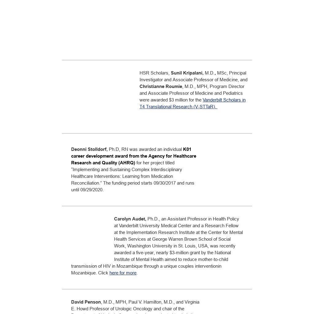 Deonni Stolldorf, Ph.D, RN was awarded an individual K01 career development award from the Agency for Healthcare Research and Quality (AHRQ) for her project titled “Implementing and Sustaining Complex Interdisciplinary Healthcare Interventions: Learning from Medication Reconciliation.” The funding period starts 09/30/2017 and runs until 09/29/2020.