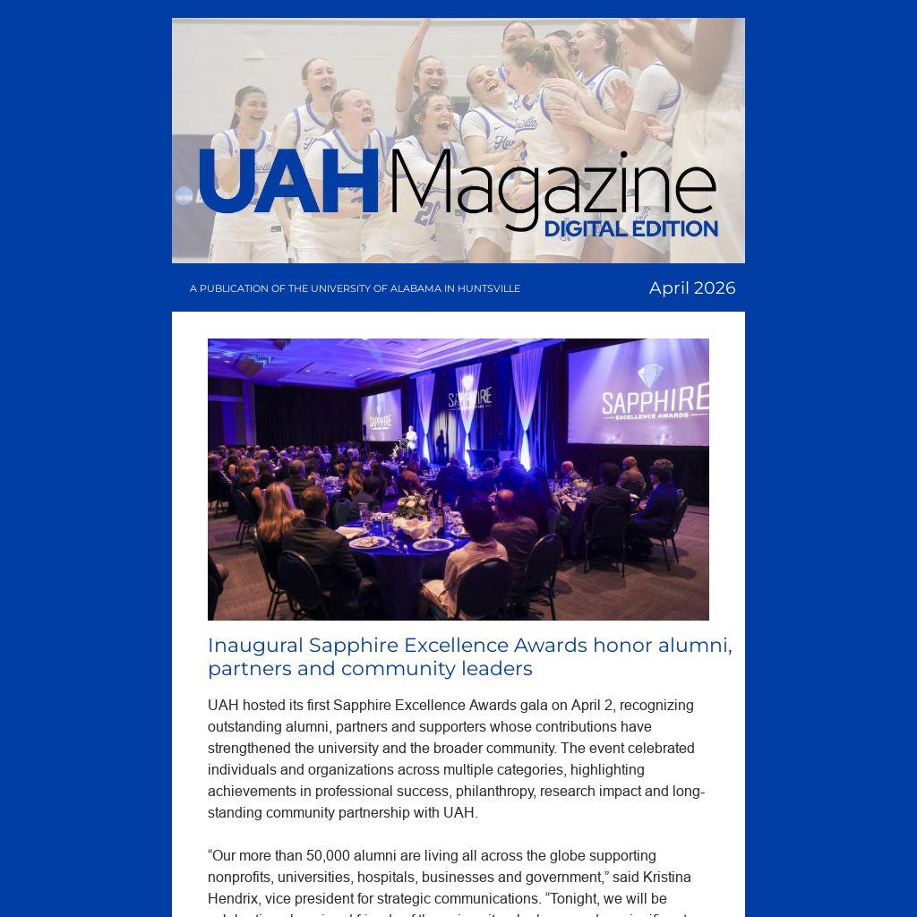 UAH hosted its first Sapphire Excellence Awards gala on April 2, recognizing outstanding alumni, partners and supporters whose contributions have strengthened the university and the broader community. The event celebrated individuals and organizations across multiple categories, highlighting achievements in professional success, philanthropy, research impact and long-standing community partnership with UAH.
