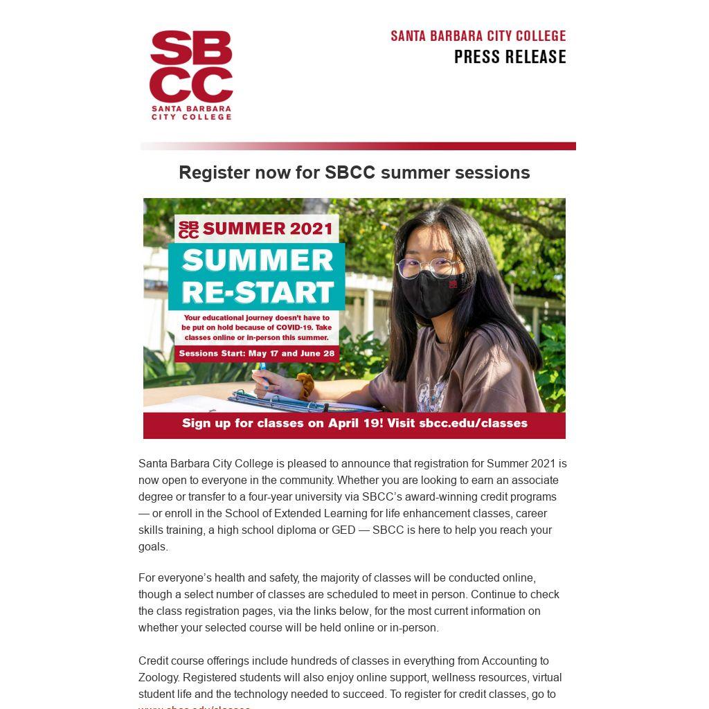 Santa Barbara City College is pleased to announce that registration for Summer 2021 is now open to everyone in the community. Whether you are looking to earn an associate degree or transfer to a four-year university via SBCC’s award-winning credit programs — or enroll in the School of Extended Learning for life enhancement classes, career skills training, a high school diploma or GED — SBCC is here to help you reach your goals.