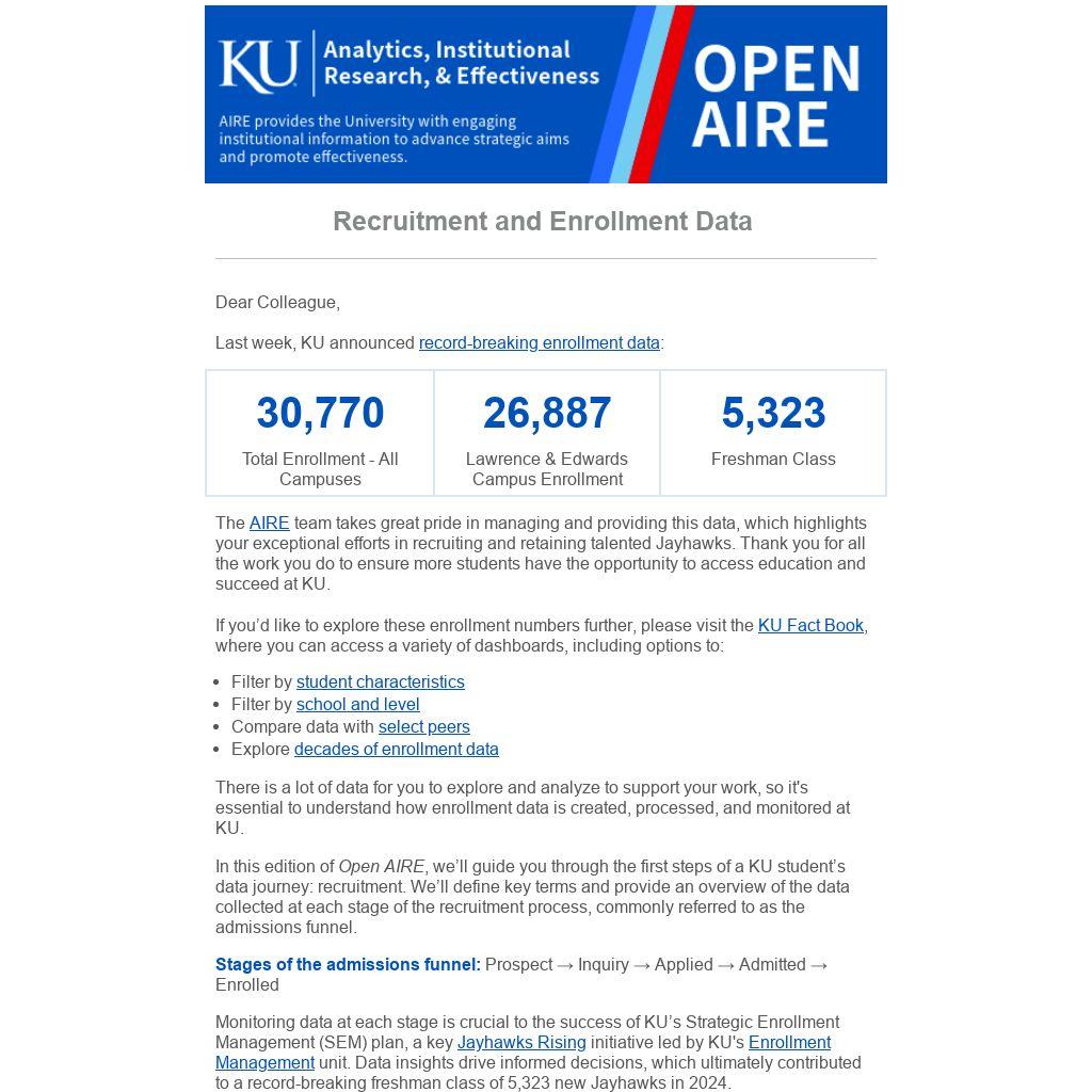 If you have any questions about recruitment and enrollment data, or any other data-related question, please contact AIRE at AIRE-help@ku.edu.