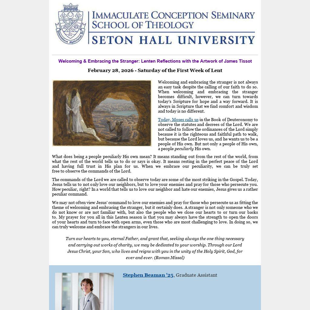 We may not often view Jesus’ command to love our enemies and pray for those who persecute us as fitting the theme of welcoming and embracing the stranger, but it certainly does. A stranger is not only someone who we do not know or are not familiar with, but also the people who we close our hearts to or turn our backs to. My prayer for you all in this Lenten season is that you may always have the strength to open the doors of your hearts and turn to face with open arms, even those who are most challenging to love. In doing so, we can truly welcome and embrace the strangers in our lives.