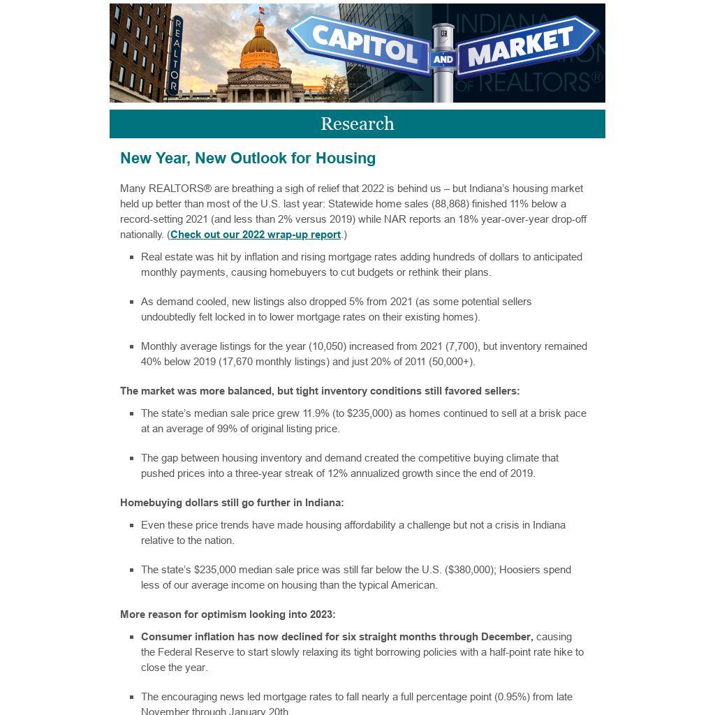 Many REALTORS® are breathing a sigh of relief that 2022 is behind us – but Indiana’s housing market held up better than most of the U.S. last year: Statewide home sales (88,868) finished 11% below a record-setting 2021 (and less than 2% versus 2019) while NAR reports an 18% year-over-year drop-off nationally. (Check out our 2022 wrap-up report.)