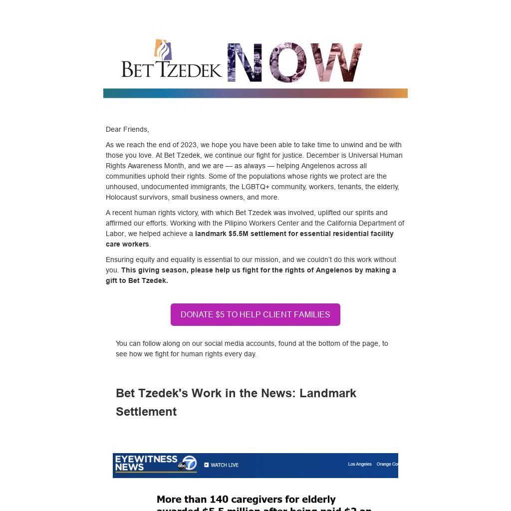 As we reach the end of 2023, we hope you have been able to take time to unwind and be with those you love. At Bet Tzedek, we continue our fight for justice. December is Universal Human Rights Awareness Month, and we are — as always — helping Angelenos across all communities uphold their rights. Some of the populations whose rights we protect are the unhoused, undocumented immigrants, the LGBTQ+ community, workers, tenants, the elderly, Holocaust survivors, small business owners, and more.
