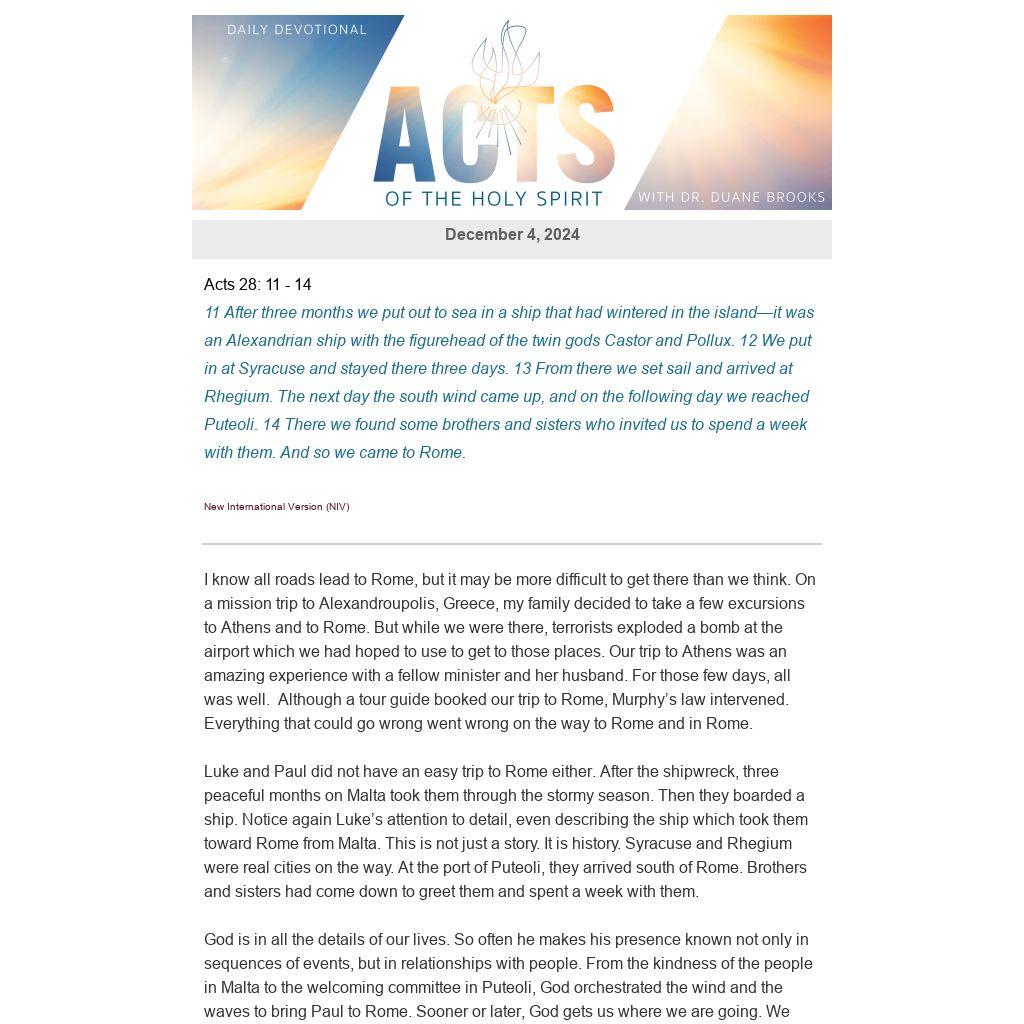 God is in all the details of our lives. So often he makes his presence known not only in sequences of events, but in relationships with people. From the kindness of the people in Malta to the welcoming committee in Puteoli, God orchestrated the wind and the waves to bring Paul to Rome. Sooner or later, God gets us where we are going. We may endure many dangers, toils, and snares along the way, but “God leads his dear children along.” Our lives are strengthened measurably through fellowship with brothers and sisters along the way.