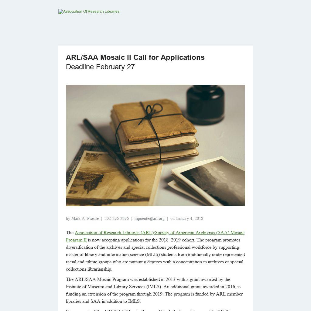 Association of Research Libraries (ARL)/Society of American Archivists (SAA) Mosaic Program II is now accepting applications for the 2018–2019 cohort. The program promotes diversification of the archives and special collections professional workforce by supporting master of library and information science (MLIS) students from traditionally underrepresented racial and ethnic groups who are pursuing degrees with a concentration in archives or special collections librarianship.
