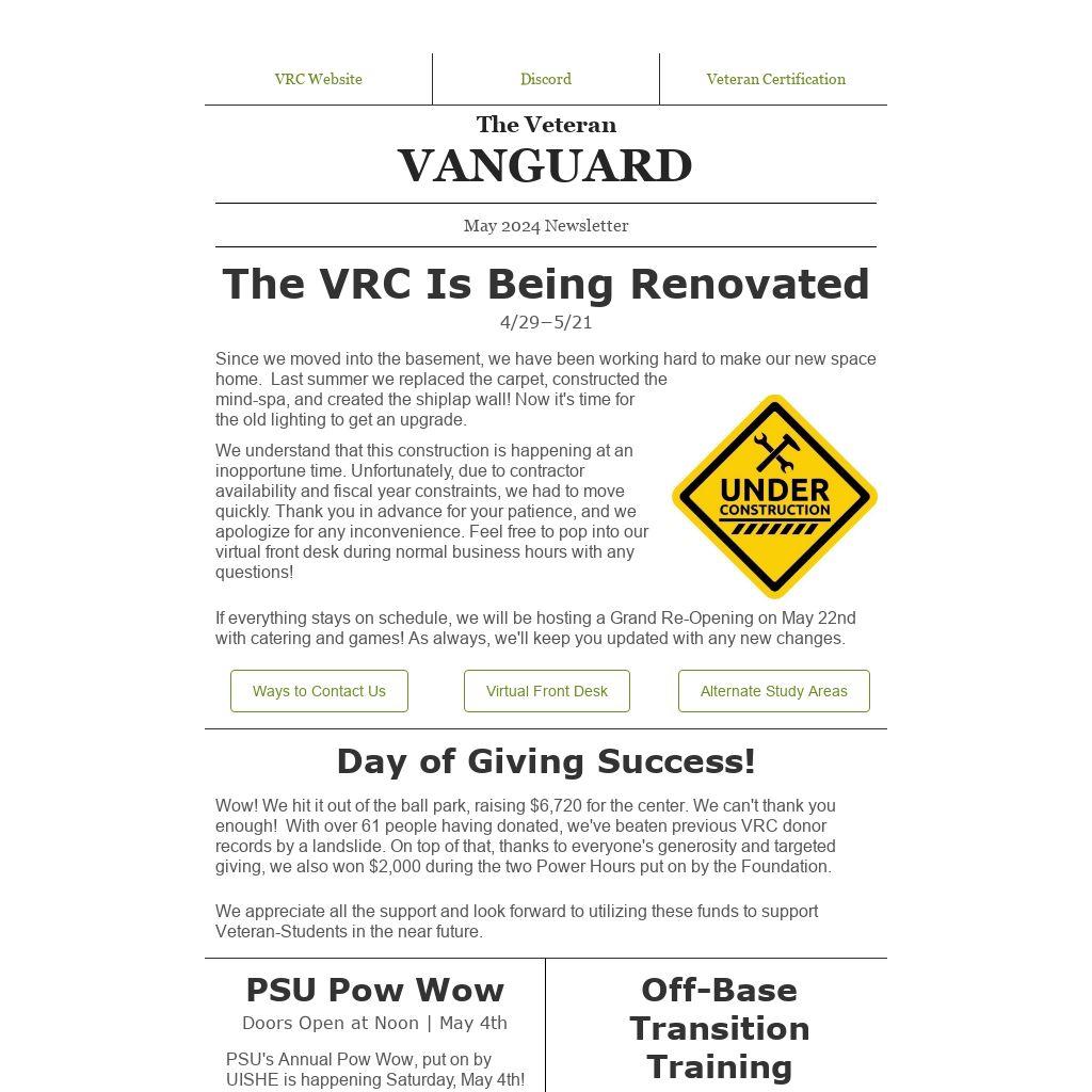 If you were planning on coming to the VRC's Summer Orientation on May 17th, it will now be fully online. Moreover, our weekly social hour is headed to our virtual front desk for the length of the construction!