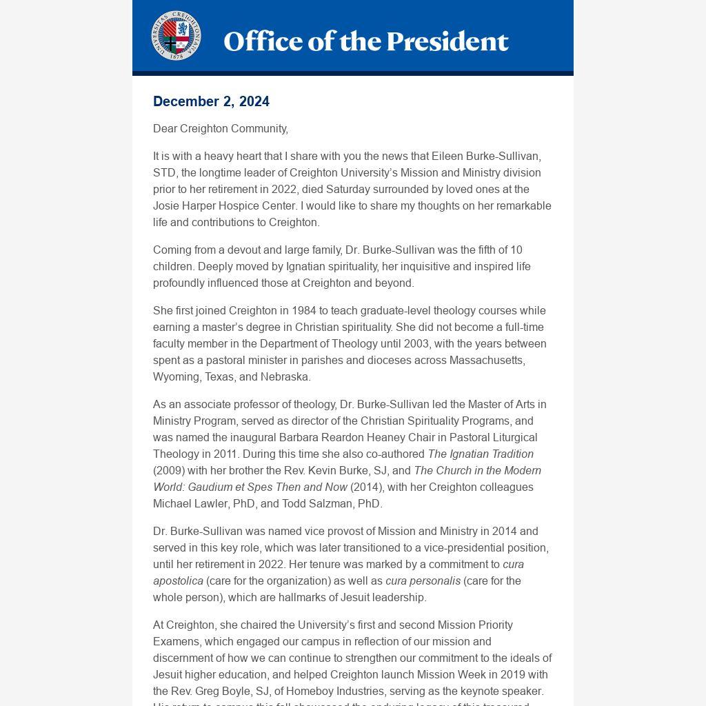 It is with a heavy heart that I share with you the news that Eileen Burke-Sullivan, STD, the longtime leader of Creighton University’s Mission and Ministry division prior to her retirement in 2022, died Saturday surrounded by loved ones at the Josie Harper Hospice Center. I would like to share my thoughts on her remarkable life and contributions to Creighton.