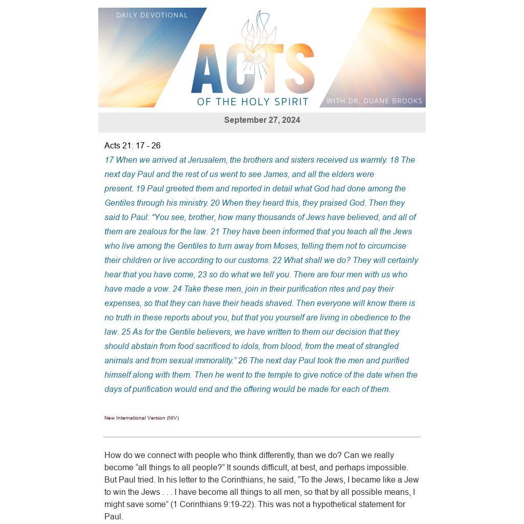 How do we connect with people who think differently, than we do? Can we really become “all things to all people?” It sounds difficult, at best, and perhaps impossible. But Paul tried. In his letter to the Corinthians, he said, “To the Jews, I became like a Jew to win the Jews . . . I have become all things to all men, so that by all possible means, I might save some” (1 Corinthians 9:19-22). This was not a hypothetical statement for Paul.