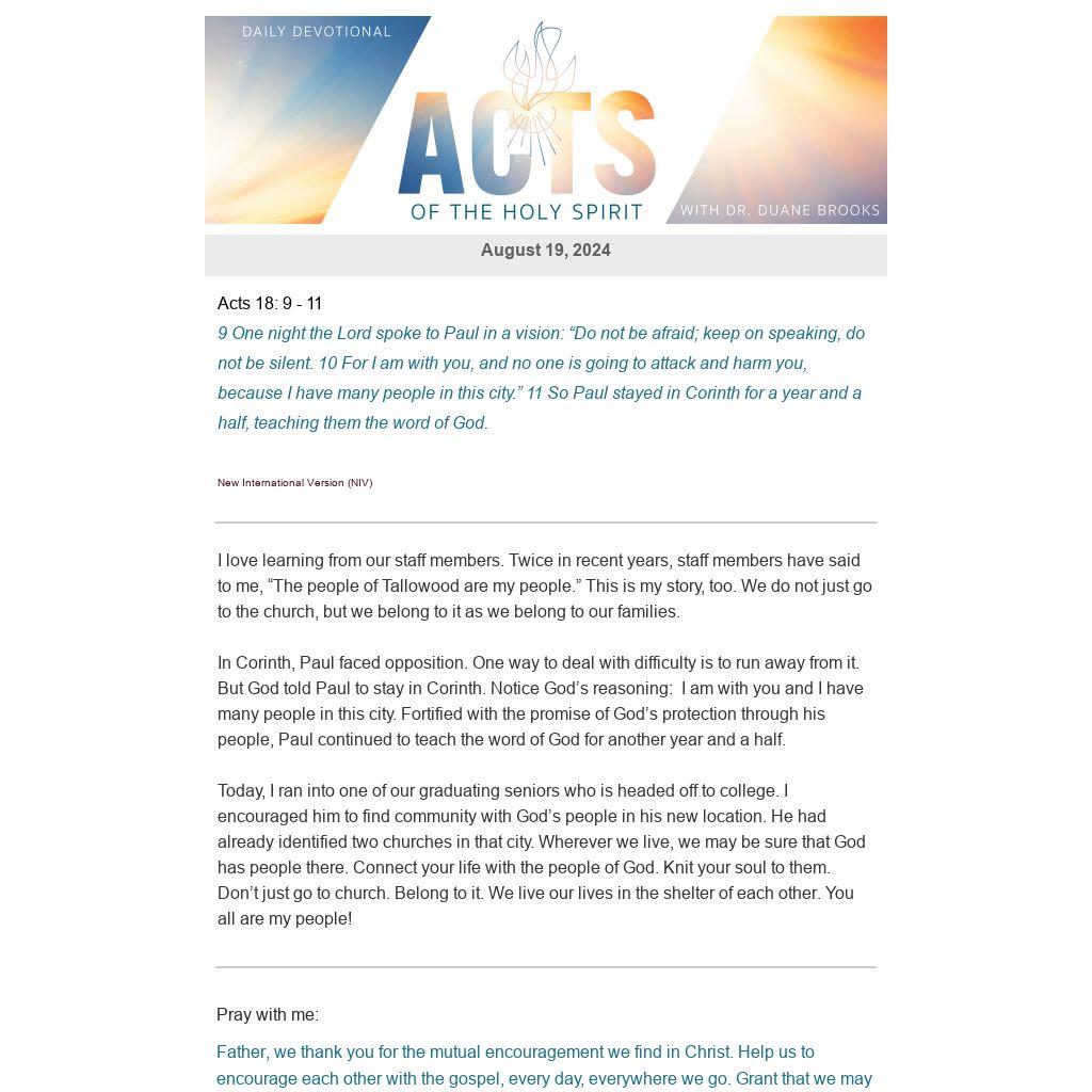 In Corinth, Paul faced opposition. One way to deal with difficulty is to run away from it. But God told Paul to stay in Corinth. Notice God’s reasoning: I am with you and I have many people in this city. Fortified with the promise of God’s protection through his people, Paul continued to teach the word of God for another year and a half.