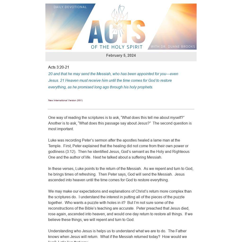 In these verses, Luke points to the return of the Messiah. As we repent and turn to God, he brings times of refreshing. Then Peter says, God will send the Messiah. Jesus ascended into heaven until the time comes for God to restore everything.