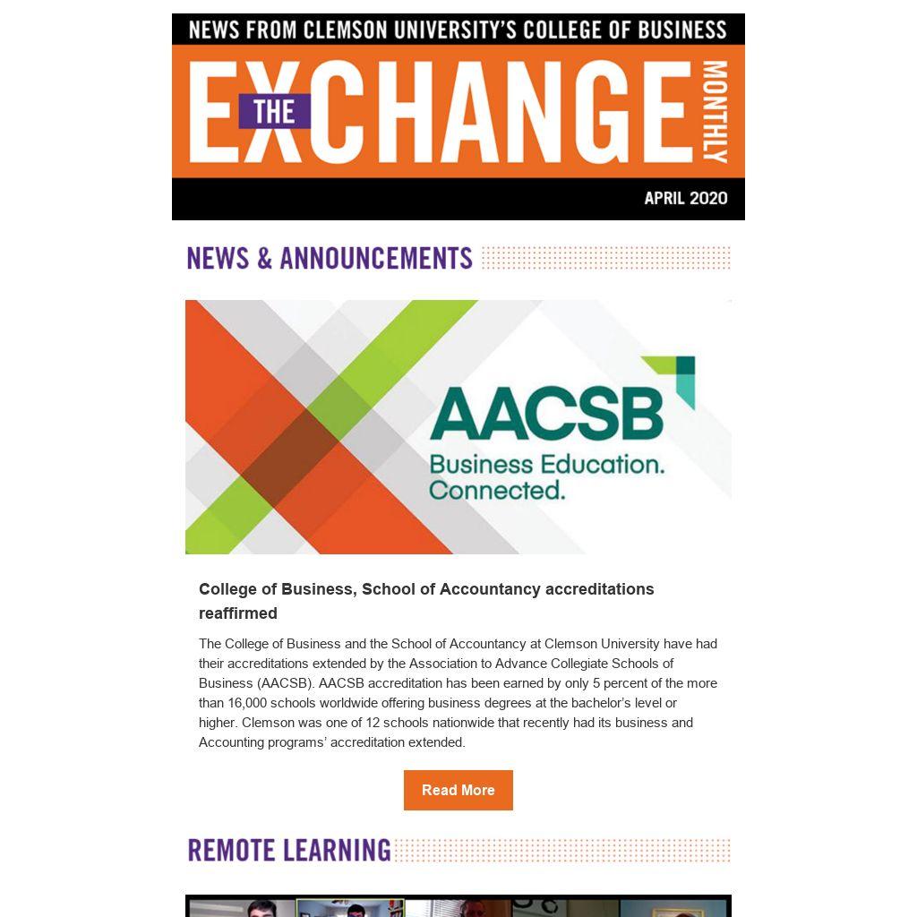 The College of Business and the School of Accountancy at Clemson University have had their accreditations extended by the Association to Advance Collegiate Schools of Business (AACSB). AACSB accreditation has been earned by only 5 percent of the more than 16,000 schools worldwide offering business degrees at the bachelor’s level or higher. Clemson was one of 12 schools nationwide that recently had its business and Accounting programs’ accreditation extended.