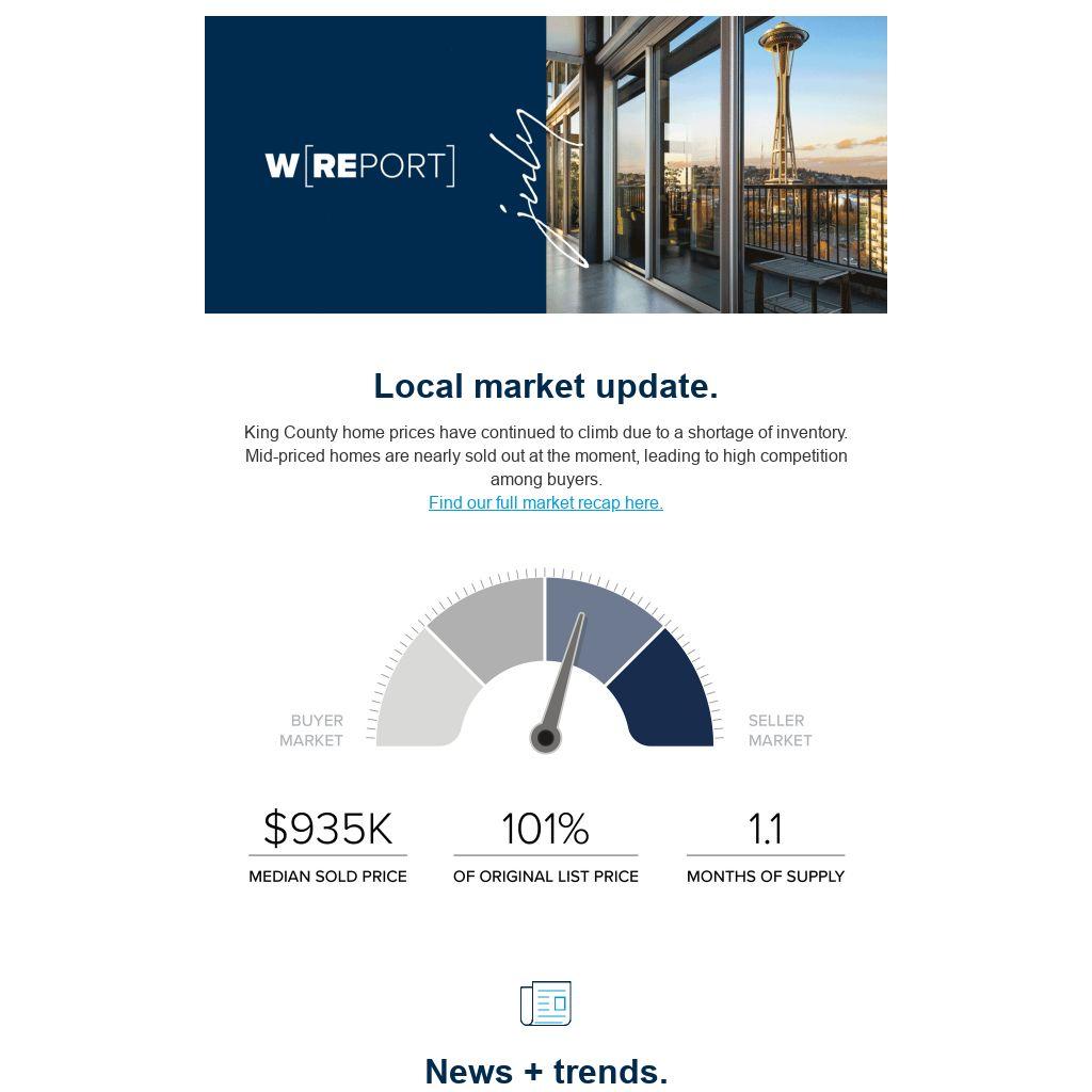King County home prices have continued to climb due to a shortage of inventory. Mid-priced homes are nearly sold out at the moment, leading to high competition among buyers. Find our full market recap here.