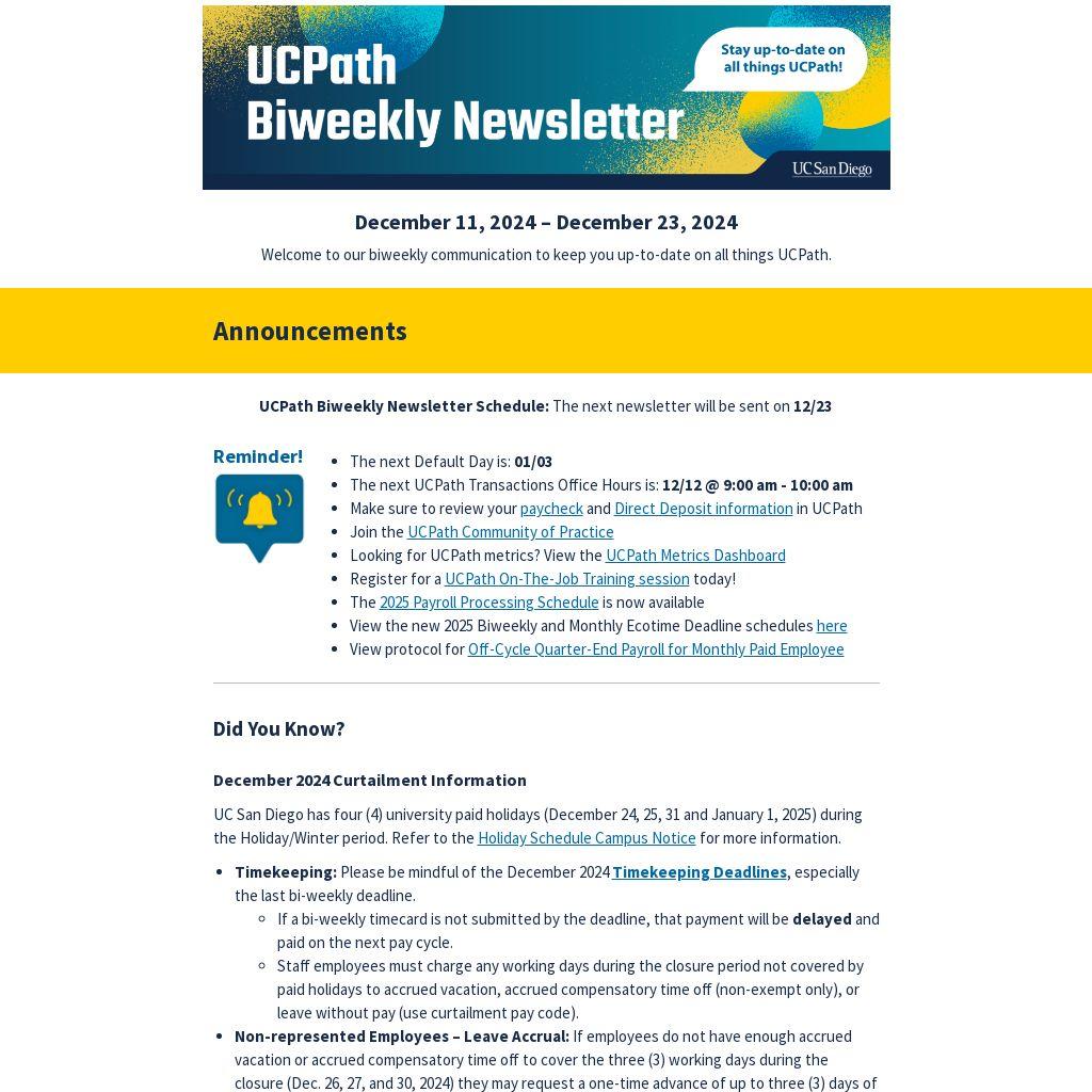 UCPath Biweekly Newsletter Schedule: The next newsletter will be sent on 12/23 |