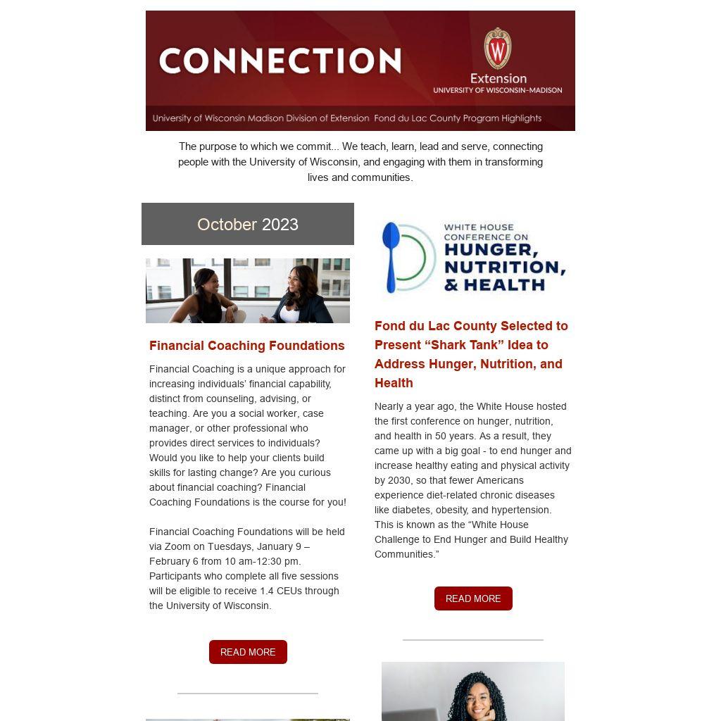 Financial Coaching Foundations will be held via Zoom on Tuesdays, January 9 – February 6 from 10 am-12:30 pm. Participants who complete all five sessions will be eligible to receive 1.4 CEUs through the University of Wisconsin.
