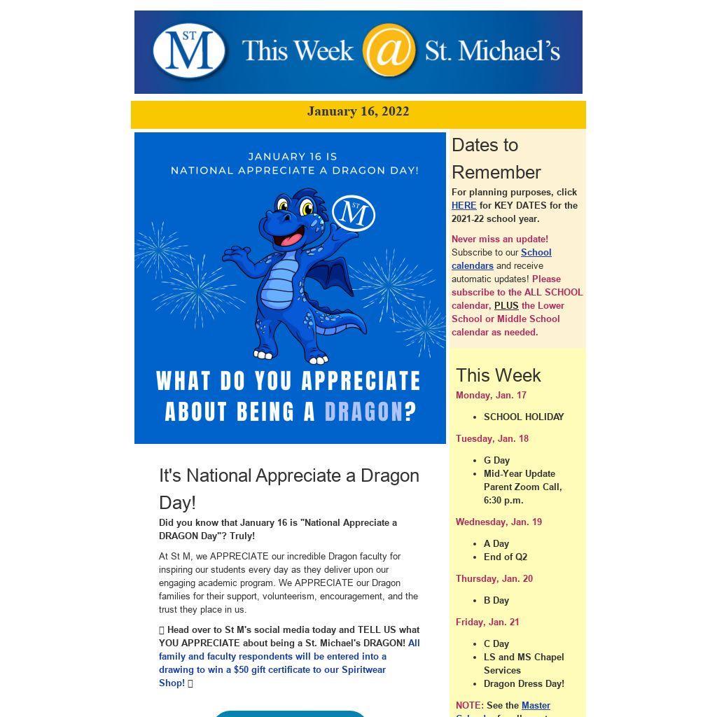 💙 Head over to St M's social media today and TELL US what YOU APPRECIATE about being a St. Michael's DRAGON! All family and faculty respondents will be entered into a drawing to win a $50 gift certificate to our Spiritwear Shop! 💙