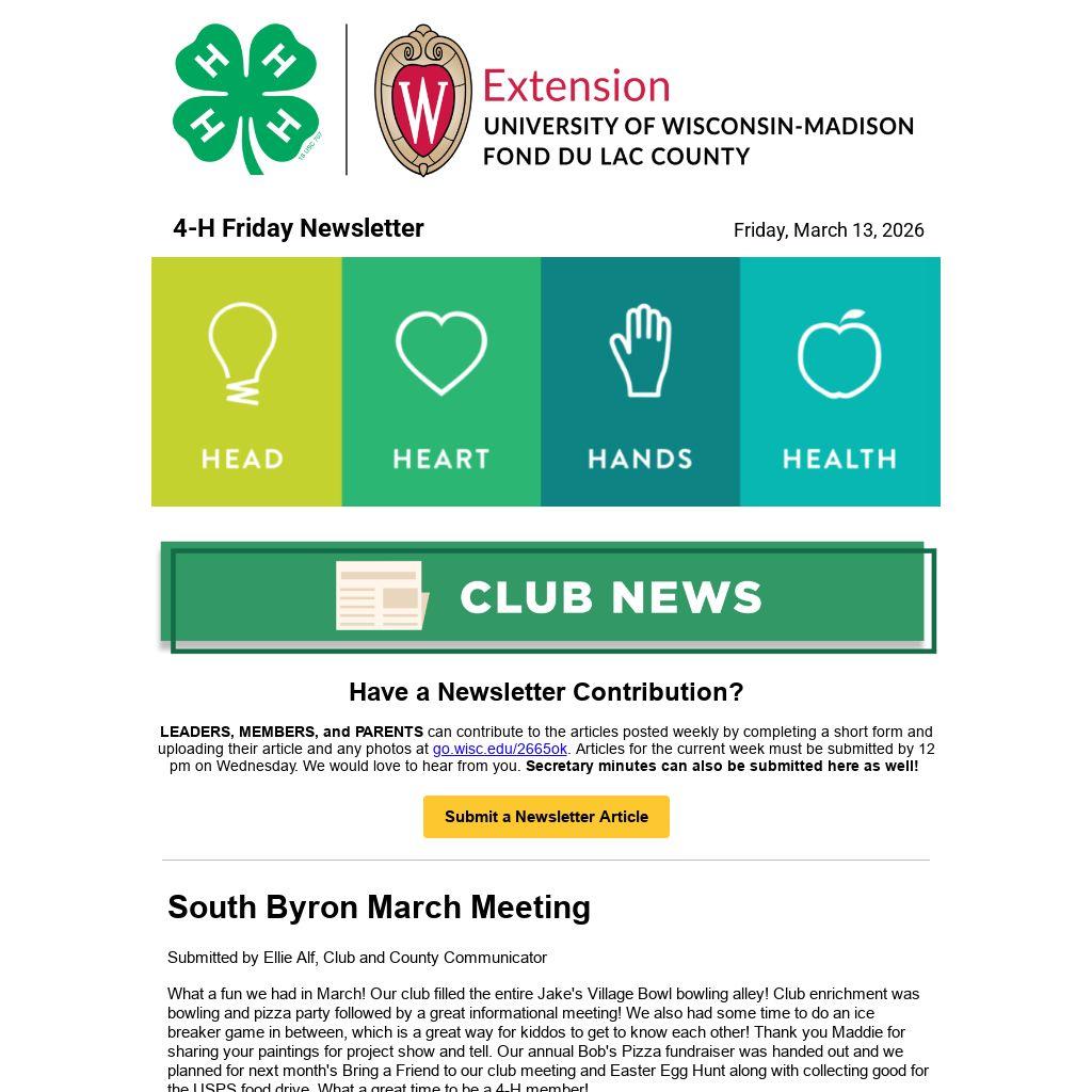 LEADERS, MEMBERS, and PARENTS can contribute to the articles posted weekly by completing a short form and uploading their article and any photos at go.wisc.edu/2665ok. Articles for the current week must be submitted by 12 pm on Wednesday. We would love to hear from you. Secretary minutes can also be submitted here as well!