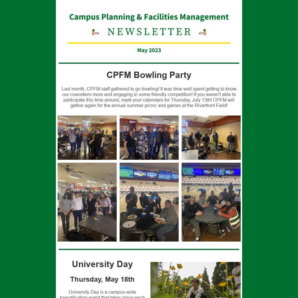 Last month, CPFM staff gathered to go bowling! It was time well spent getting to know our coworkers more and engaging in some friendly competition! If you weren't able to participate this time around, mark your calendars for Thursday, July 13th! CPFM will gather again for the annual summer picnic and games at the Riverfront Field!