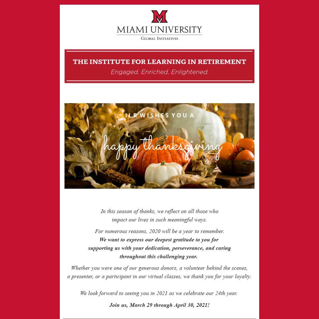 Side dishesNo Thanksgiving feast would be complete without a heaping side of great music, courtesy of our friends from the Southwestern Ohio Symphonic Band. This week, they take us to Italy. Learn and hear more.Start the new year with a good read. Join the Miami University Alumni Association's Book Club, open to the ILR community. The January-March 2021 book selection title is The Guernsey Literary and Potato Peel Pie Society, by Mary Ann Shaffer. We will begin the reading period on January 7th! Please get the book as soon as you can! You might also consider checking your local bookstores or public library (get on their waiting list now).