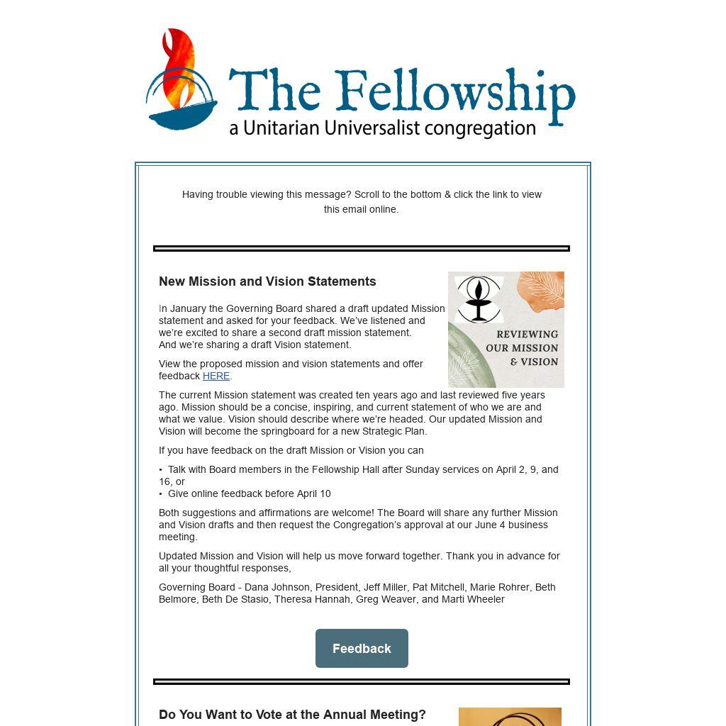 2023 Annual Congregational SurveyThe Fellowship Governing Board and Executive Team are hoping that all members and friends of the Fellowship will participate in our annual congregational survey. The information gathered in this survey is of critical importance as we evaluate progress toward the Fellowship’s goals and identify areas in which we need to dedicate additional time and resources. Your opinion counts.