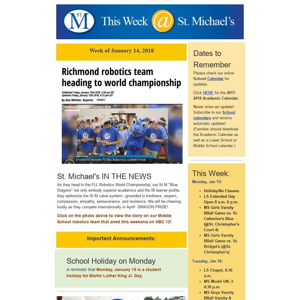 St. Michael's IN THE NEWSAs they head to the FLL Robotics World Championship, our St M "Blue Dragons" not only embody superior academics and the IB learner profile, they epitomize the St M value system-- grounded in kindness, respect, compassion, empathy, perseverance, and resilience. We will be cheering loudly as they compete internationally in April! DRAGON PRIDE!