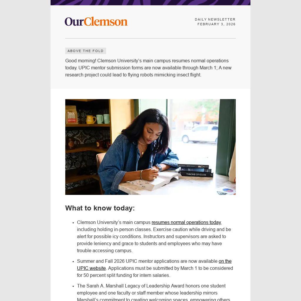 Good morning! Clemson University’s main campus resumes normal operations today. UPIC mentor submission forms are now available through March 1; A new research project could lead to flying robots mimicking insect flight.
