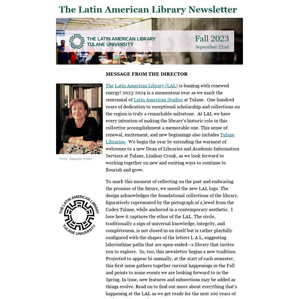 The Latin American Library (LAL) is buzzing with renewed energy! 2023-2024 is a momentous year as we mark the centennial of Latin American Studies at Tulane. One hundred years of dedication to exceptional scholarship and collections on the region is truly a remarkable milestone. At LAL we have every intention of making the library’s historic role in this collective accomplishment a memorable one. This sense of renewal, excitement, and new beginnings also includes Tulane Libraries. We begin the year by extending the warmest of welcomes to a new Dean of Libraries and Academic Information Services at Tulane, Lindsay Cronk, as we look forward to working together on new and exciting ways to continue to flourish and grow.