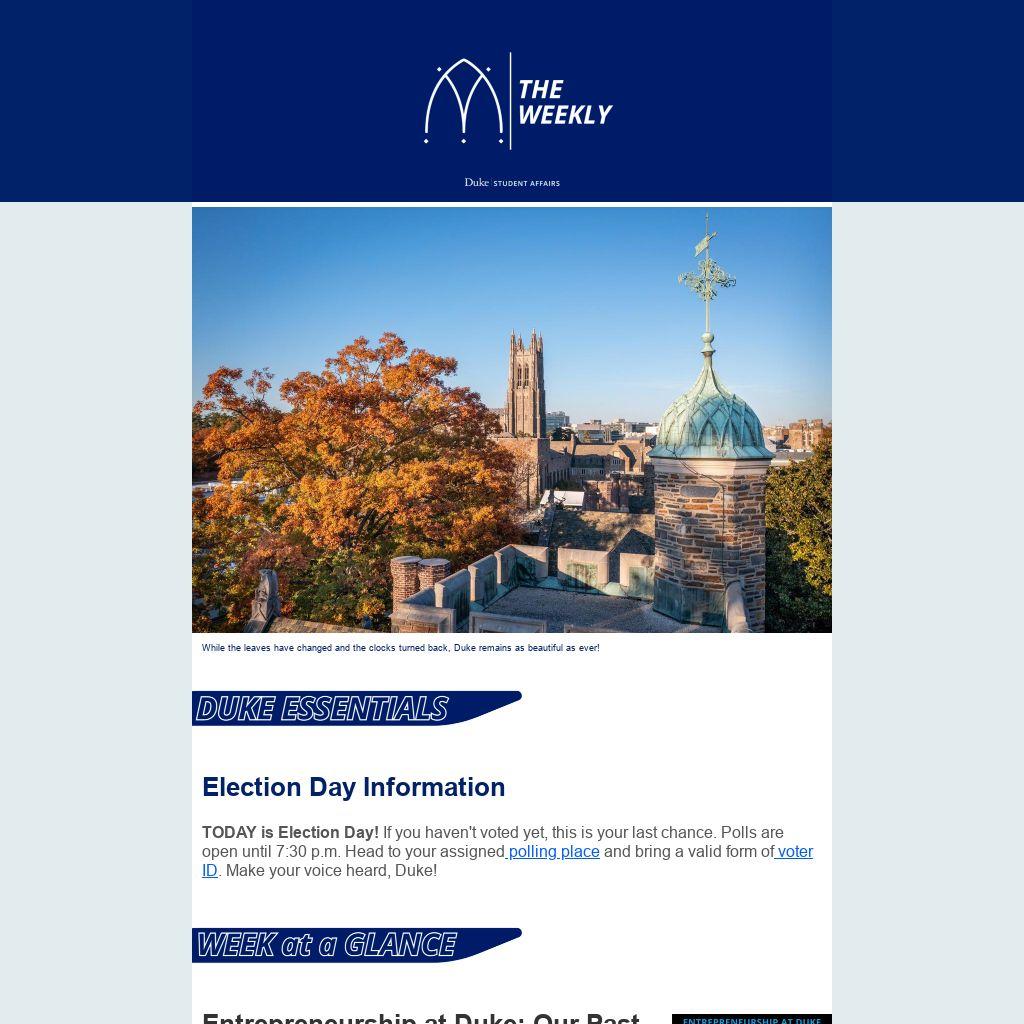 TODAY is Election Day! If you haven't voted yet, this is your last chance. Polls are open until 7:30 p.m. Head to your assigned polling place and bring a valid form of voter ID. Make your voice heard, Duke!