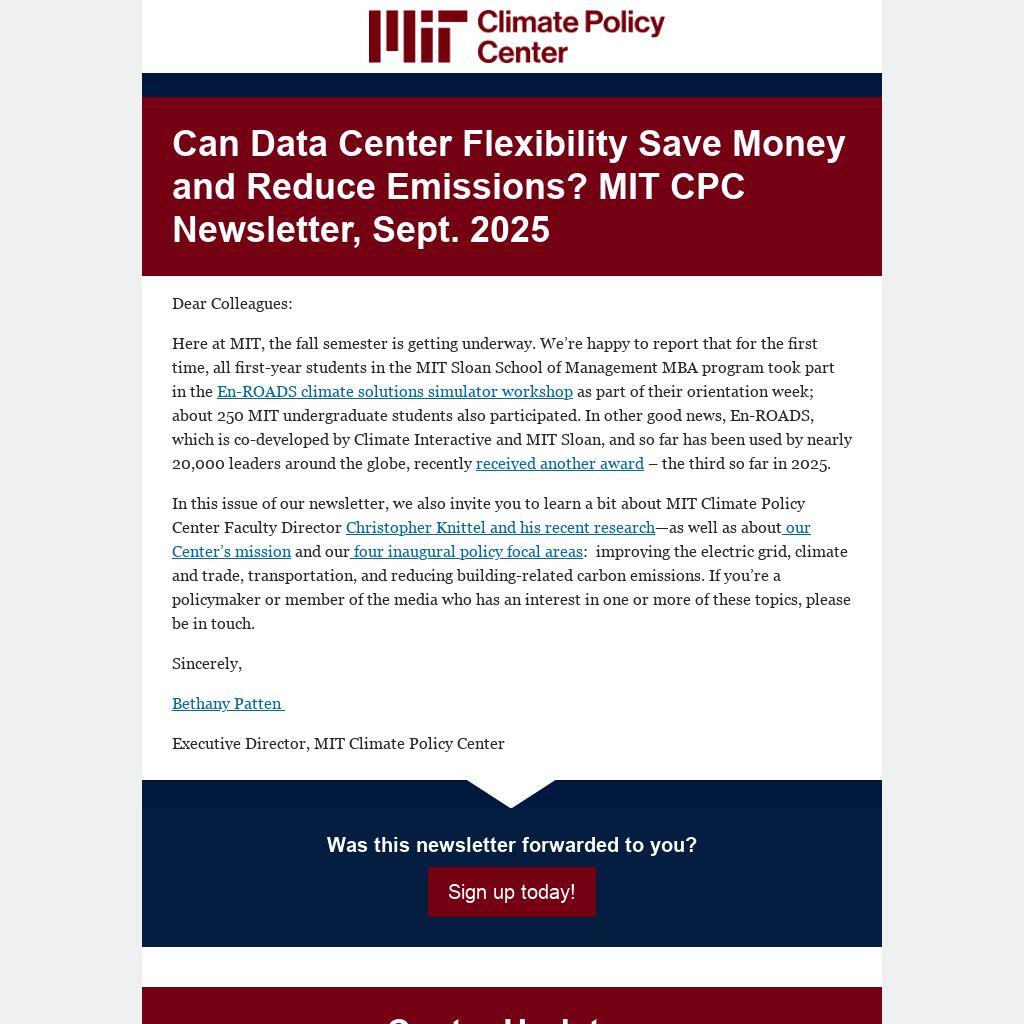 In this issue of our newsletter, we also invite you to learn a bit about MIT Climate Policy Center Faculty Director Christopher Knittel and his recent research—as well as about our Center’s mission and our four inaugural policy focal areas: improving the electric grid, climate and trade, transportation, and reducing building-related carbon emissions. If you’re a policymaker or member of the media who has an interest in one or more of these topics, please be in touch.